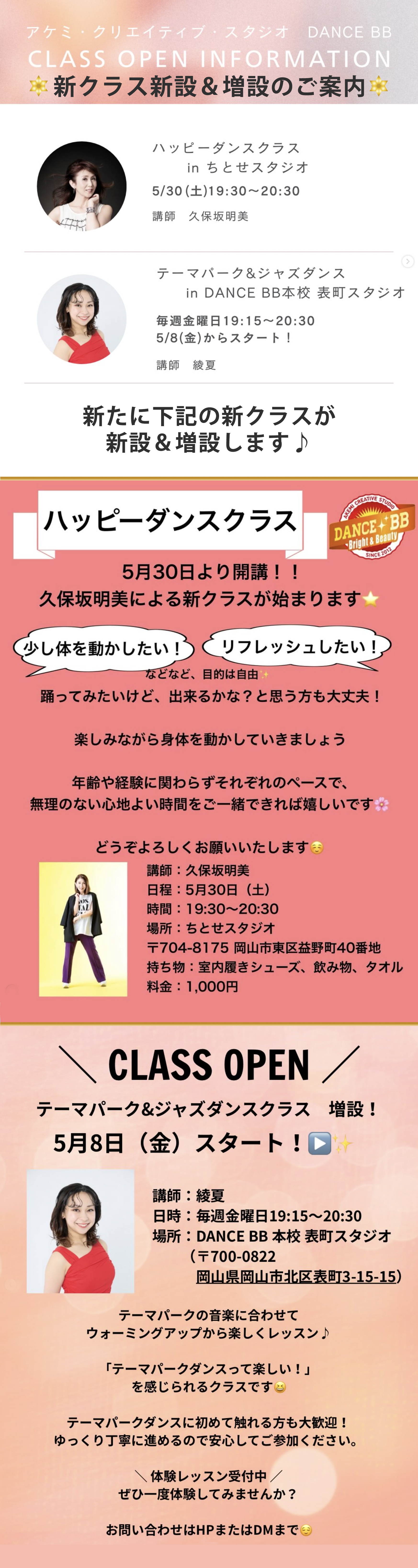 DANCE BBに**新クラス&増設クラスがスタート**します! ▼NEW CLASS OPEN▼ DANCE BB講師《久保坂明美》による新クラス \ハッピーダンスクラス/ 日程:5月30日(土)スタート(不定期開催) 時間:19:30〜20:30 場所:ちとせスタジオ (岡山市東区益野町)対象:35歳以上 レッスン料:1000円 ▼CLASS OPEN(増設)▼ DANCE BB講師《綾夏》による増設クラス \テーマパーククラス/ 日程:5月8日(金)スタート 時間:19:15〜20:30 場所:Dance BB本校 表町スタジオ (岡山市北区表町3丁目)対象:年齢不問(何歳でも大歓迎!) 詳細 DANCE BB Instagramへ